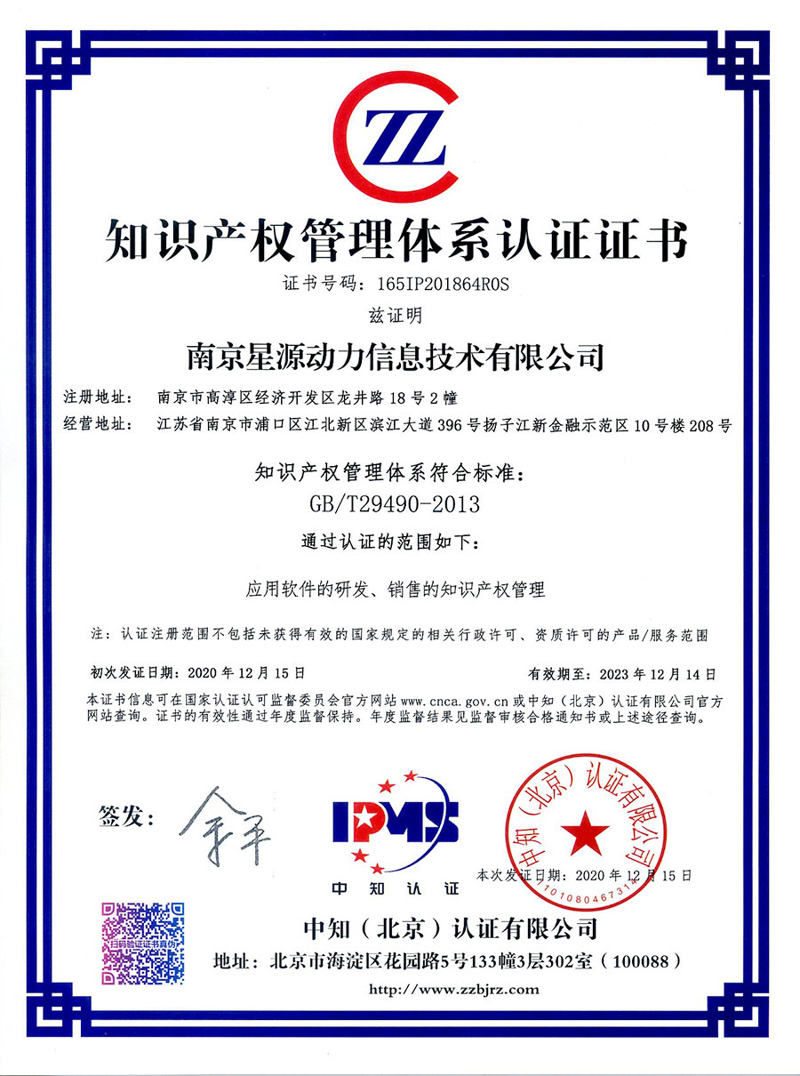 经过一年的准备,2020年12月15日,南京星源动力信息技术有限公司顺利通过《企业知识产权管理规范》(GB/T 29490-2013)审核认证,并获得相关证书。